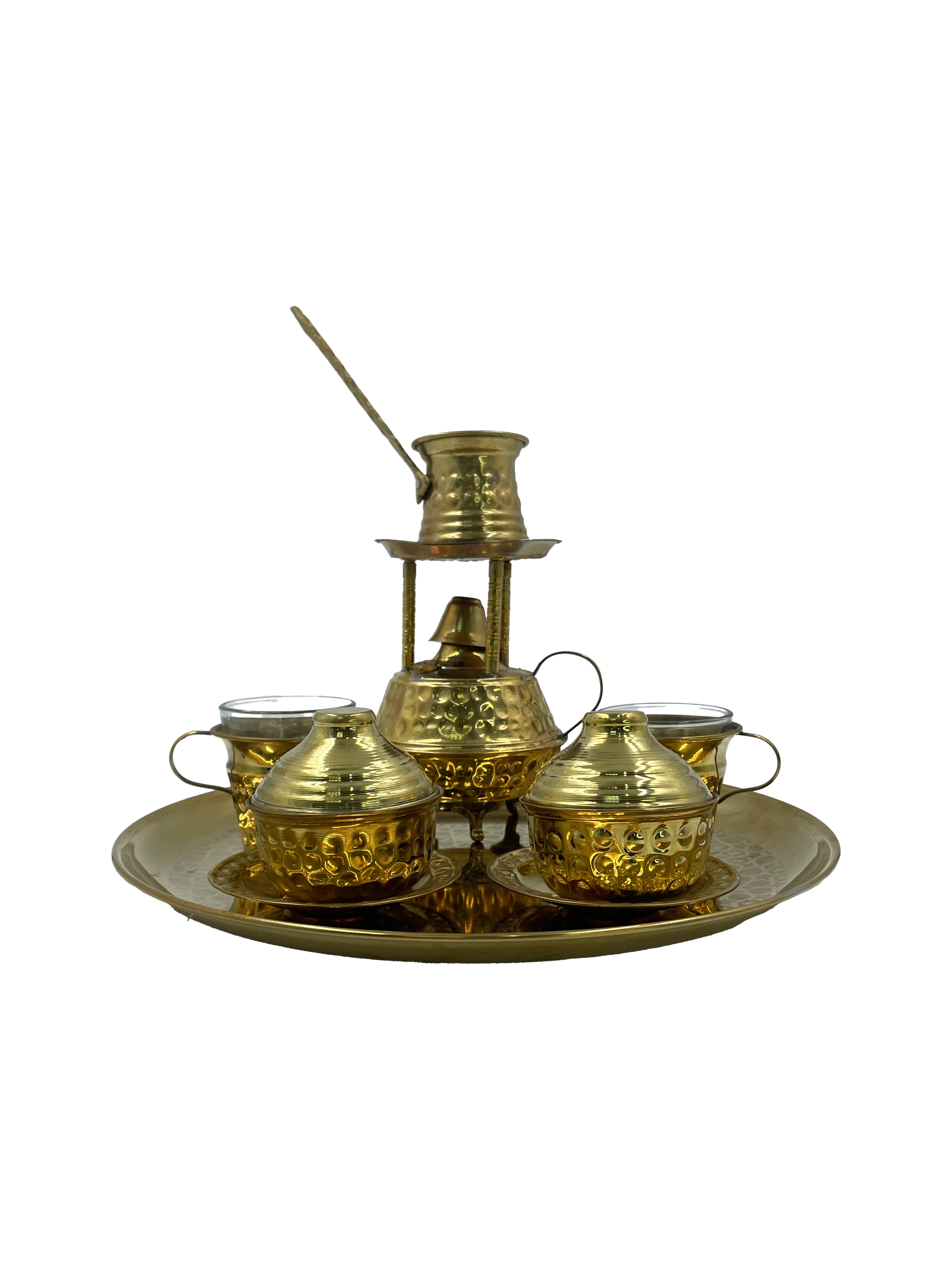 طقم قهوة تركي نحاسي فاخر يتميز بتصميم كلاسيكي أنيق ولمعان ذهبي يعكس سحر الطابع الشرقي الأصيل. مصنوع يدويًا من النحاس عالي الجودة لضمان المتانة ولمسة فنية فريدة.